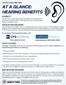 You and your covered dependents are eligible for a hearing benefit once every four years. When you use participating providers affiliated with Comprehensive Professional Systems (CPS) or NationsHearing, you may receive a hearing examination, a new digital hearing aid (with battery), and other services all at little or no cost. Call CPS at (212) 675-5745 or NationsHearing at (800) 480-0558 to find a provider near you.